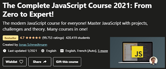 This is the most complete JavaScript course on Udemy. It's an all-in-one package that will take you from the very fundamentals of JavaScript, all the way to building modern and complex applications.